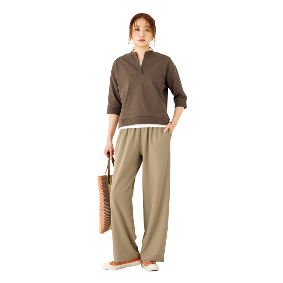 やわらかな素材と、裾に向けて広がりすぎずにすとんと落ちるシルエットで、大人もはきやすいワイド。ウエストは総ゴムでラクなはき心地。※春夏秋におすすめです。