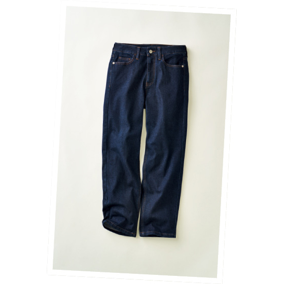 タテヨコにグ〜ンと伸びて、ひざの曲げ伸ばしもラクちん。本格デニムのディテールで、おしゃれしながらこっそり快適なはき心地。リベット使い、5ポケット、前開きファスナーの本格デニム。※通年着用できます。
