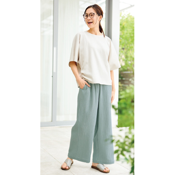 2重ガーゼでふわり、くしゅっとした表面で肌さらり。ゆるりとくつろげるシルエットに仕立てました。
