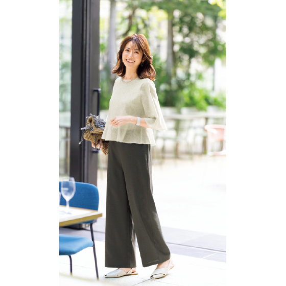ふわっと開くベル袖と、ティアード風に重ねたフレア裾。薄手でドライな編み地で、透け感も涼しげなニットです。内側の裾をボトムにインして、丈や甘さがアレンジできます。