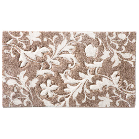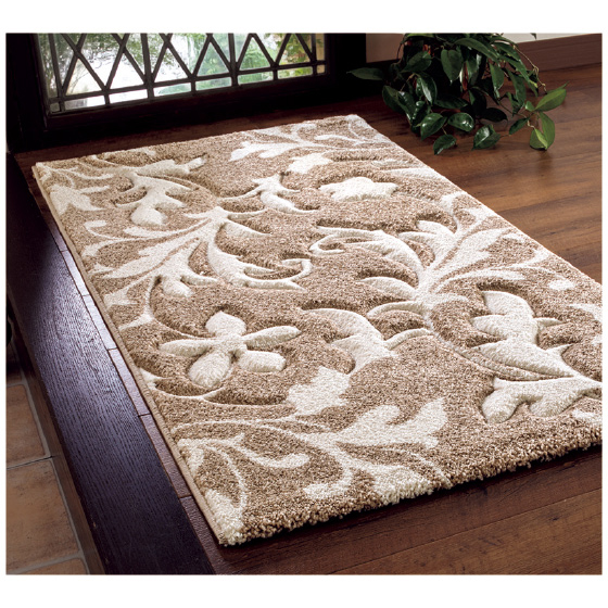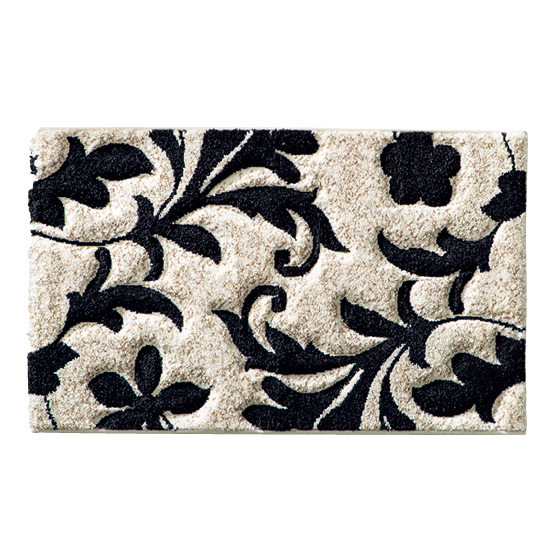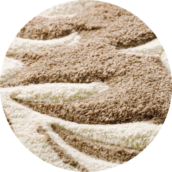 英国発祥のウィルトン織に、柄を浮き立たせるカービング加工を施した珍しい一枚。ウィルトン織は、しっかりとしたボリューム感と耐久性が大きな特長です。一本一本の糸を交錯させながらがっちりと織り込んでいくため、毛足の根元が詰まった状態に仕上がります。長い毛足ながらへたったり遊び毛が出たりしにくく、その丈夫さは靴で生活する文化圏生まれならではのものといえます。本品は基布に麻を用い、抗菌防臭性も備えています。