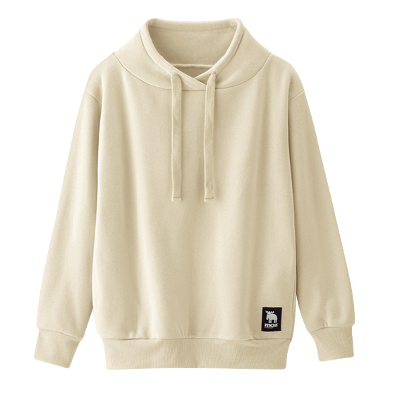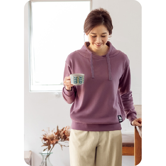 ちょっと横になりたいときにうれしい、フードを省いたパーカー風デザイン。よい高さの衿が首元をやさしく包んで、暖かな着心地です。フードがないから洗濯時にかさばりにくく、冬のデイリーに活躍。
