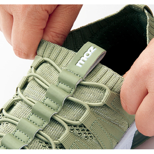 まるで靴下のような軽い履き心地のニット素材。高反発素材のインソールで快適。結ばず履けるバンジーコードを使用したスリッポンタイプ。