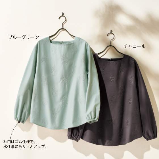 命いっぱいに咲く夏の野の花、ケサクッカをひとつずつ額に入れたデザインの柄を、前身頃にあしらいました。身生地と同色の刺繍だからナチュラル感がほどよく、コーデしやすいブラウスです。