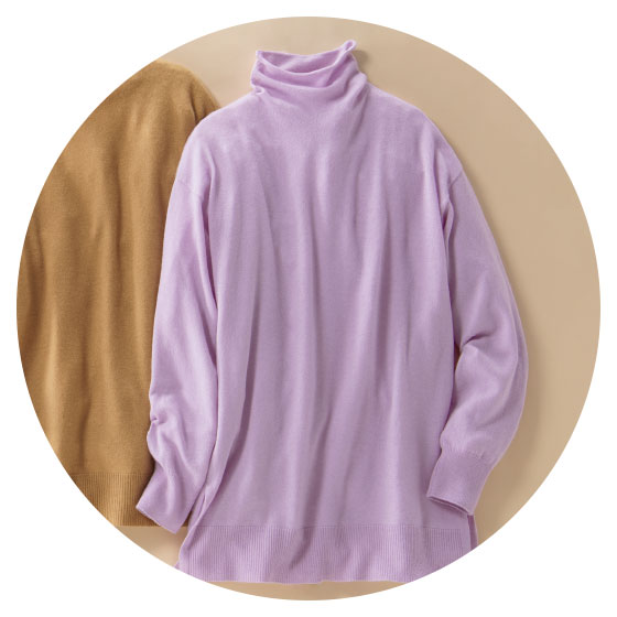 カシミヤ山羊のやわらかな原毛を使ったぜいたくな風合い。とろけるような肌触りと、やわらかく軽やかな着心地も魅力です。編み地の表面は繊細で美しい光沢感があり、大人にふさわしい上品さでコーデをワンランクアップ。