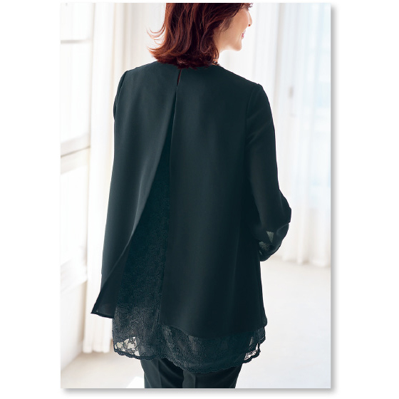 繊細な花柄レースが美しく、華やかな印象を与えます。2枚重ねの裾と背中のスリットからレースがちら見え。※着用シーズンは春夏秋です。