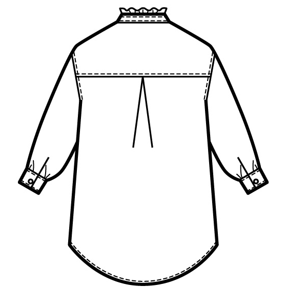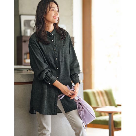 デニムの産地、岡山県「KUROKI」の軽くソフトな生地に、胸元の切替やフリル衿、パール調ボタンをあしらい、ほんのりエレガントに。季節の変わり目のはおりものとしても重宝。