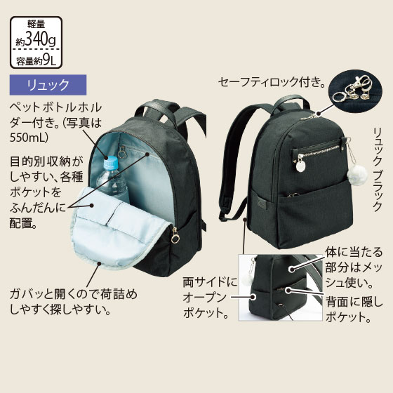 ●仕様:開閉=ラウンドファスナー式(セーフティロック付き)、ポケット=外部にオープン式2個・ファスナー式3個(うち1つの内部にオープン式1個)、内部にオープン式2個・ファスナー式1個・ペットボトルホルダー1個・ペンホルダー1個付き