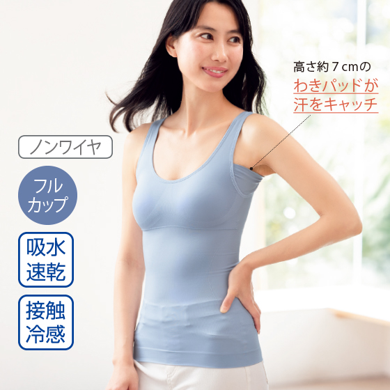 汗ばむ夏も頼れるドライ&ひんやりタッチ!また、カップ内側はメッシュ生地でムレにくい。