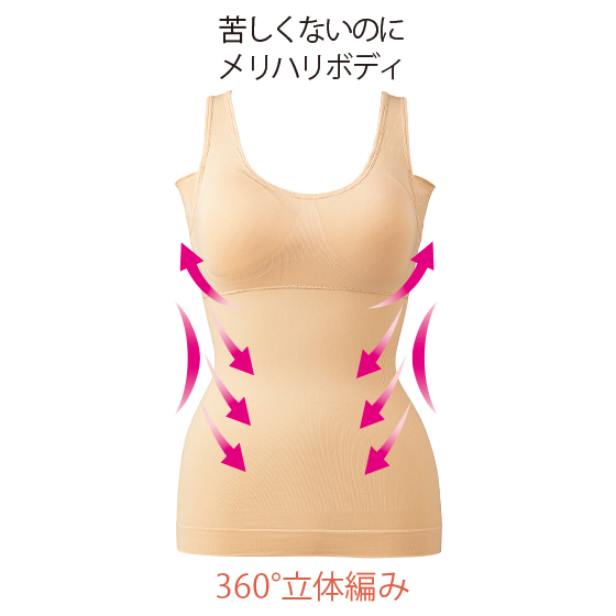 強弱をつけた立体編みがボディラインを快適に美メイク。おなかの余分なお肉を分散させ、バストも引き上げます。