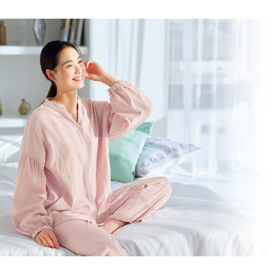 やわらかで通気性のよい2重ガーゼ素材。よく伸びて体の動きを邪魔しないので、寝る時もリラックスタイムも心地よく開放的に過ごせます。