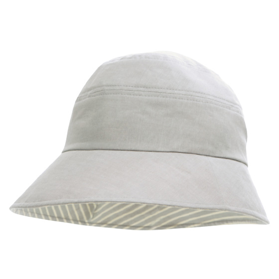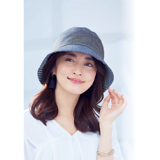 丸みのあるシルエット。大きく深めのツバで顔をしっかりカバー。エレガントな装いにもマッチ。顔回りを華やかに引き立てるストライプ柄。