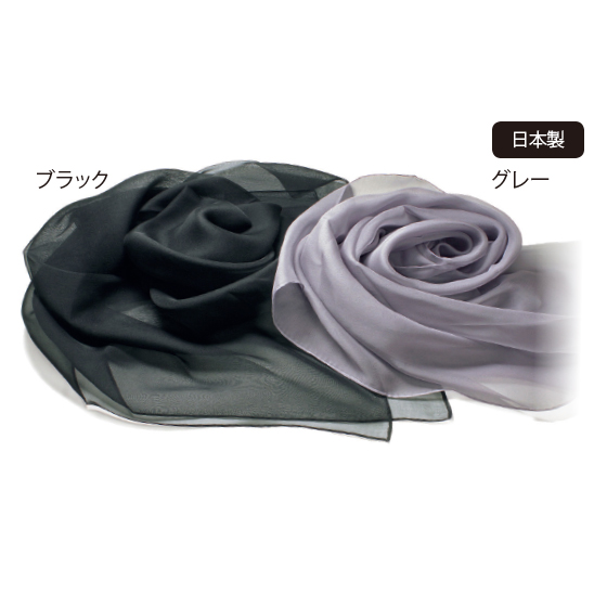正方形の大判サイズ。シルクシフォン素材で肌触りもなめらか。衿元やひざ掛けにと幅広く使えるシルク100%。
