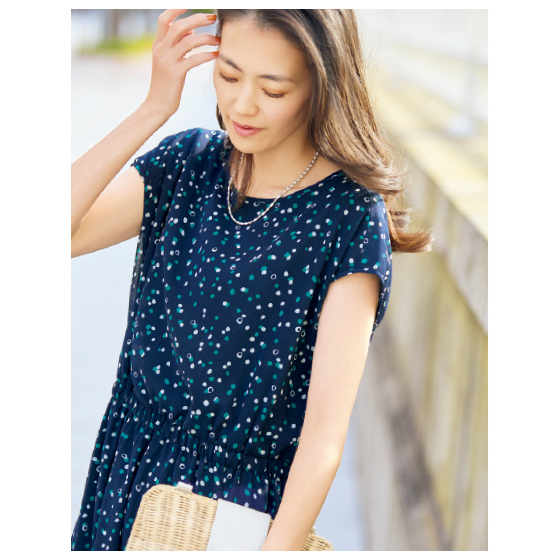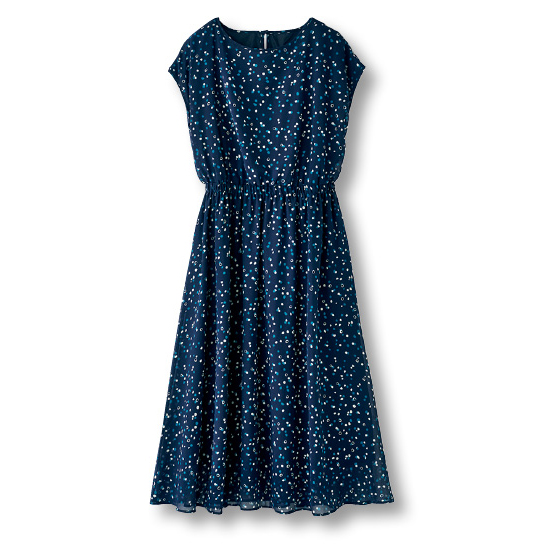 透けるネイビーがさわやかな変形ドット柄のシフォンワンピ。歩くたびに長めの裾がサラサラ揺れ、涼しげでエレガント。