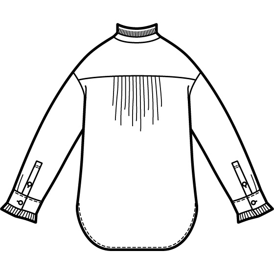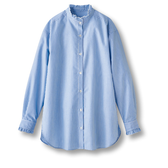 シワになりにくい機能糸を使い、お手入れを簡単にしたシャツチュニック。背中ギャザーでゆったり着られ、ボトムに1枚でお出かけコーデが完成です。肌寒いうちは、衿と袖口に効かせたフリルをニットの下からのぞかせて、映える重ね着が楽しめます。