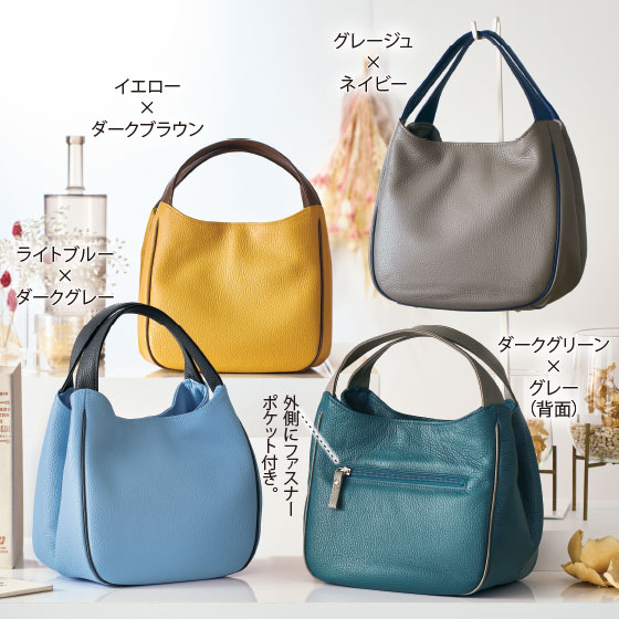 やわらかで、シボ感のあるイタリアンレザー。マストロット社のイタリアンレザーならではの美しさを堪能。コロンとかわいいフォルムも魅力のバッグ。小ぶりながら広めのマチ幅でたっぷり荷物が入ります。