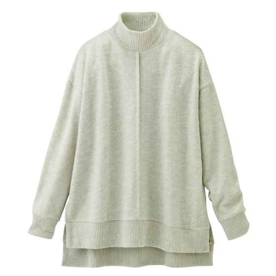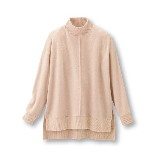 見た目はニットなのに、カットソー素材を使用。洗濯機で洗えて吊り干しもできるから、お手入れもラク。首元の太めリブがオシャレなアクセント。