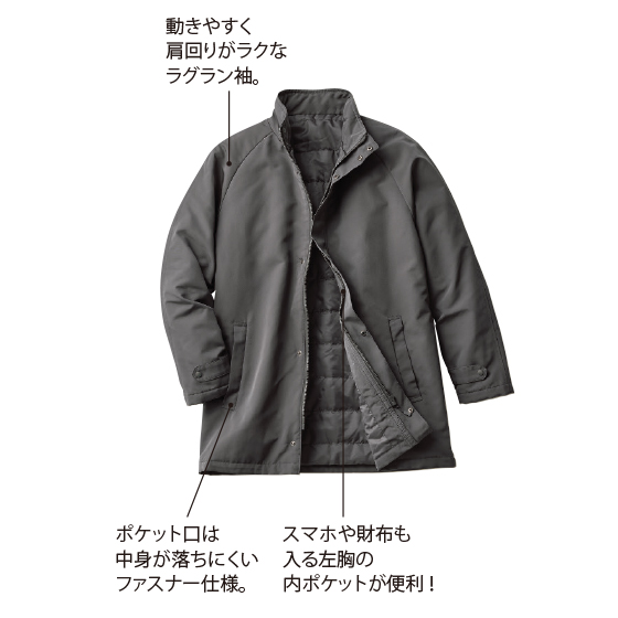 オン・オフ映えるすっきりシルエット。軽い×暖かい×はっ水の活躍コート。