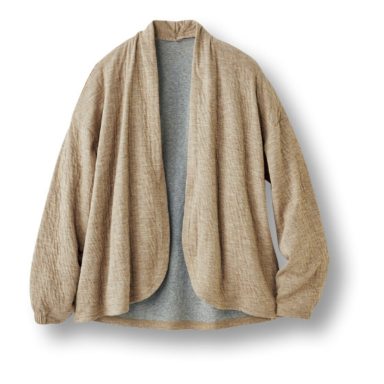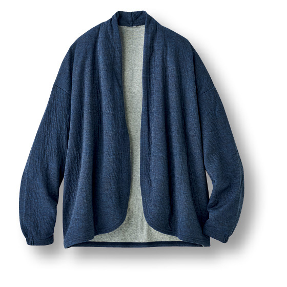綿混の接結素材で、ワッシャーのような表面感のあるソフトで軽い素材。ほどよい着丈で着回しやすい。袖口はプッシュアップしやすい後ろゴムデザイン。