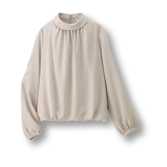 ロール衿やギャザー使いのクラシカルな胸元が上品で華やか。表地はしなやかなジョーゼット、裏地はストレッチ性のあるニットの起毛素材できれいに見せながら、暖かな着心地です。裾はゴムギャザーで、着るだけできれいなブラウジングシルエット。