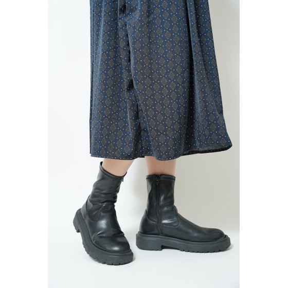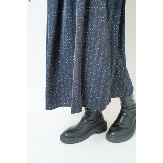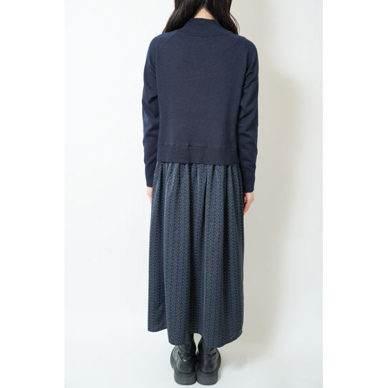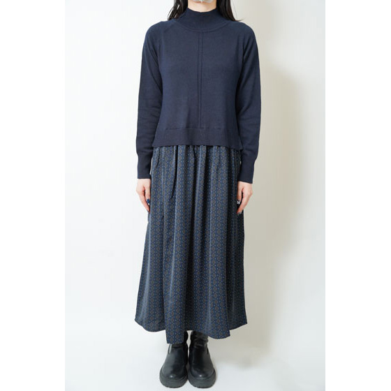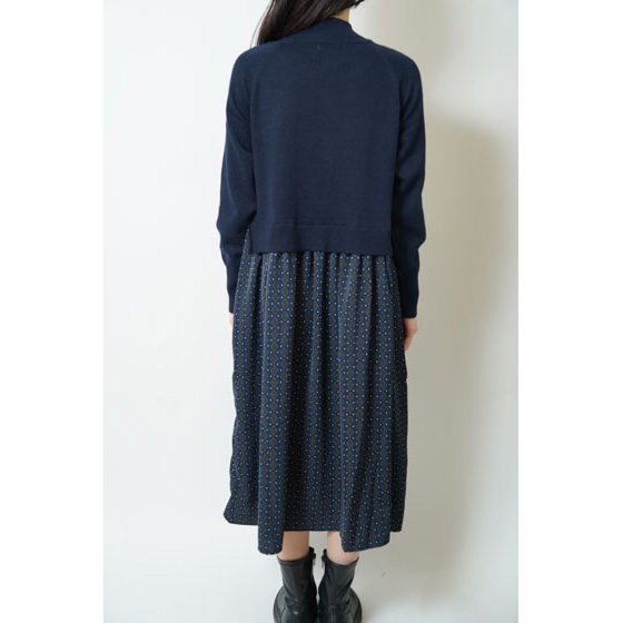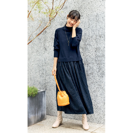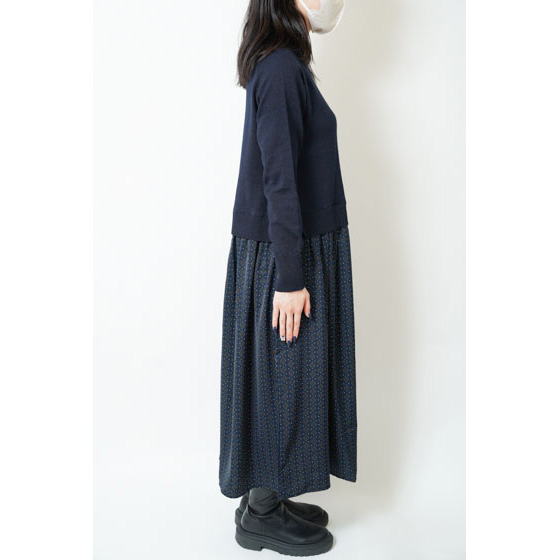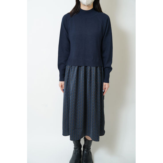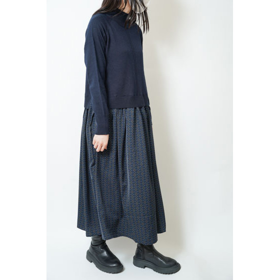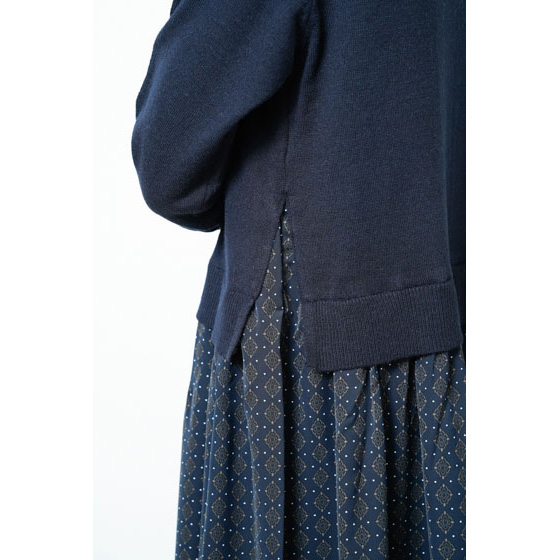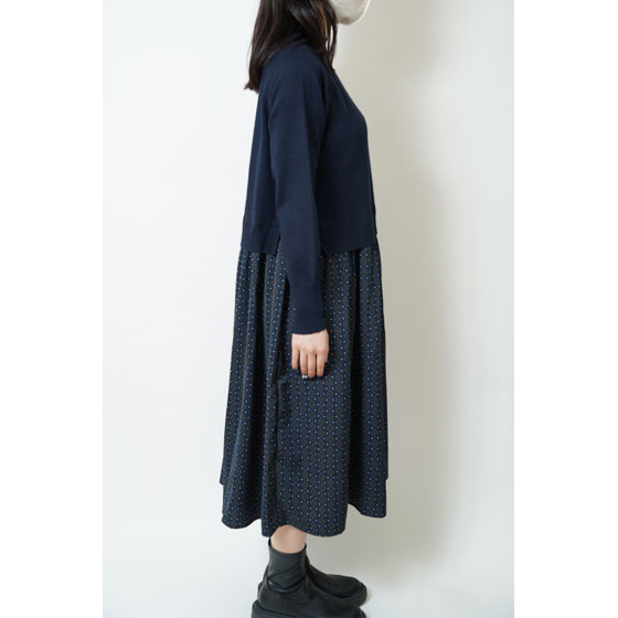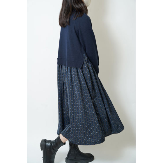 やわらかくちょうどいい肉感のニットに小紋柄のさらふわ生地のスカートを組み合わせてワンピース仕立てに。ニット裾のスリットでウエストすっきり見えして着心地もラク。着るだけで簡単にサマになる1枚。