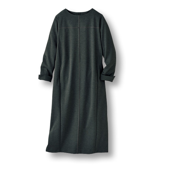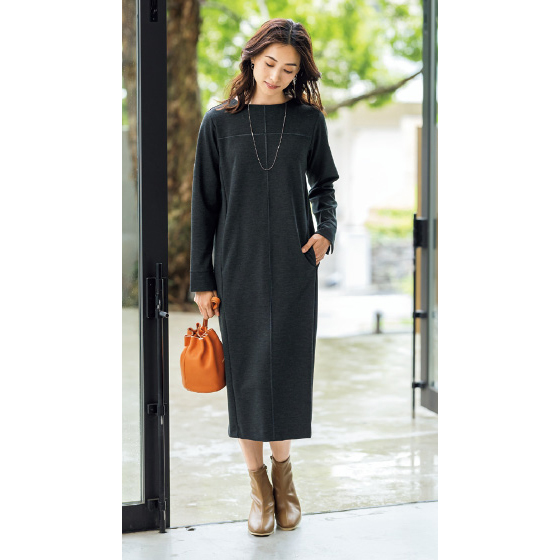 霜降り感が高見えし、冬にうれしいほどよい肉厚感のある素材。ストンと着られて体のラインを拾いにくいシルエットのサックワンピ。シンプルなので小物使いでコーデを楽しめます。前身頃の十字切替デザインで細見え効果も期待。