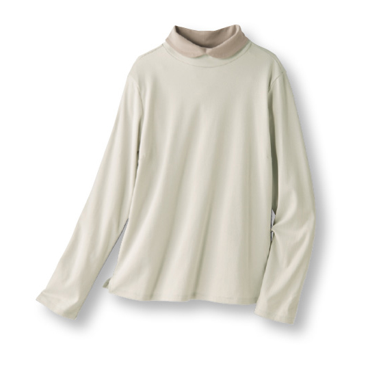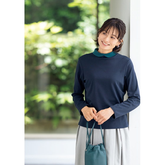 きちんと感のある配色仕立ての小ぶりな衿は、内側に折れば、同色のセミハイネックに。上品でかわいい綿100%で肌触りがよく洗濯機で洗えてお手入れラク。