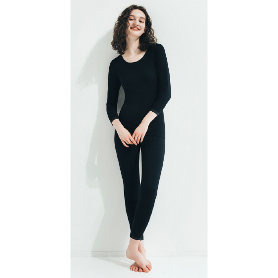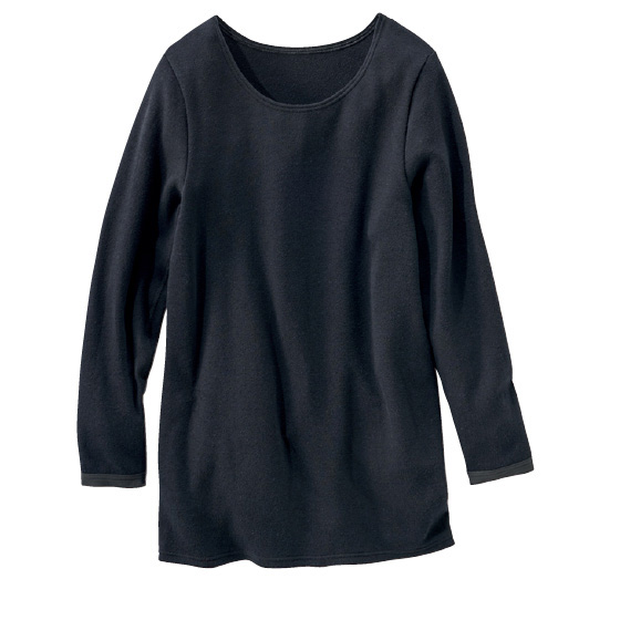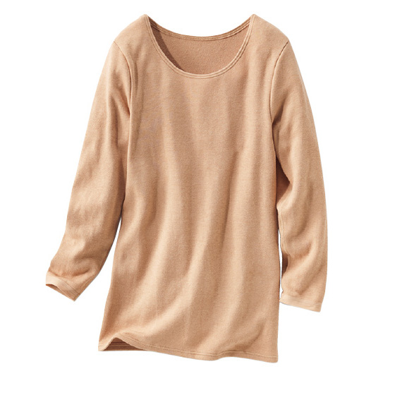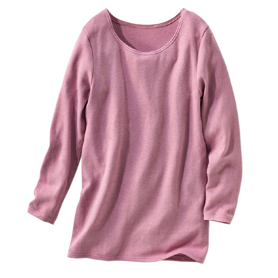 吸湿発熱の綿スムース素材に裏起毛を施し、真冬も暖か。袖下と袖口はフラット仕様で快適です。