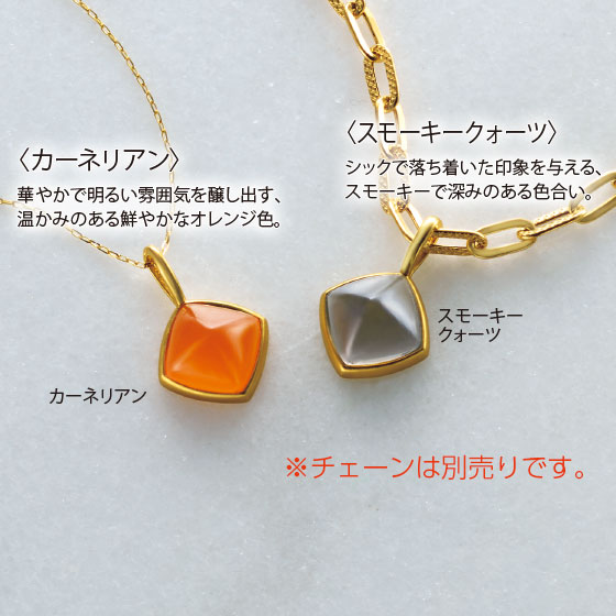 ●材質:カーネリアン=カーネリアン(約10×10mm)、スモーキークォーツ=スモーキークォーツ(約10×10mm)、地金部=18金