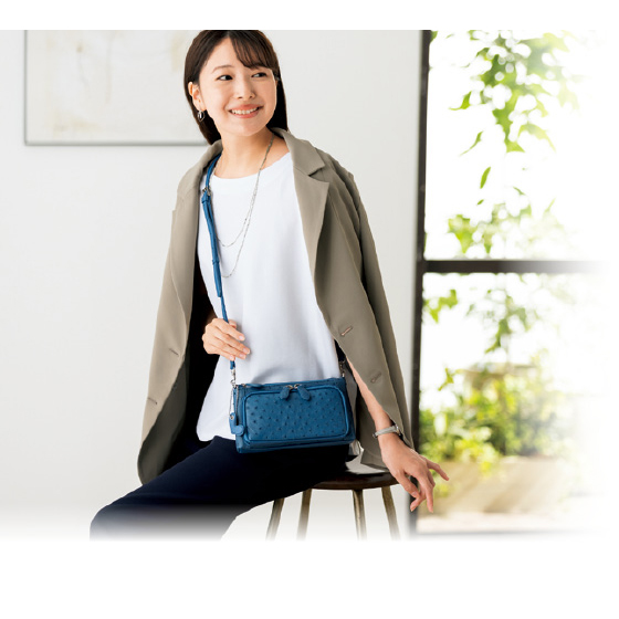 ●素材:表地=オーストリッチ革、底面/合成皮革、裏地=ポリエステル、ハンドル・ショルダーベルト=合成皮革