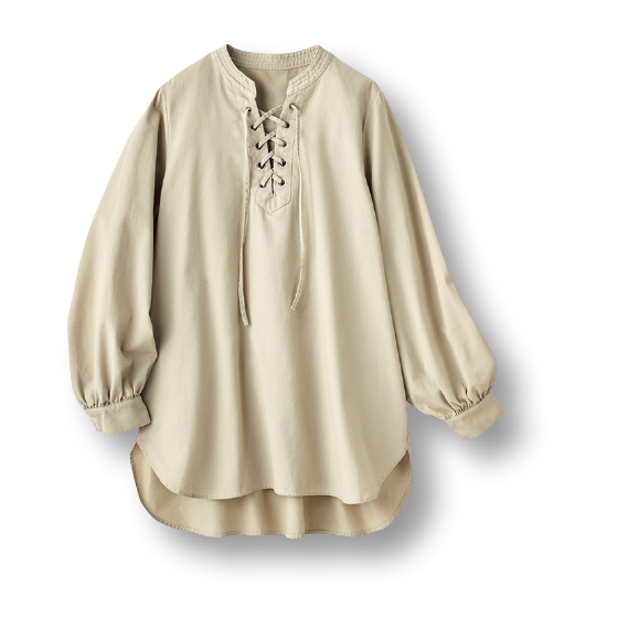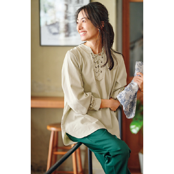 ふっくら袖と編み上げの胸元で、1枚着ればコーデが鮮度アップ。ゆったり体形カバーしながら、デニム仕立てでこなれ見え。