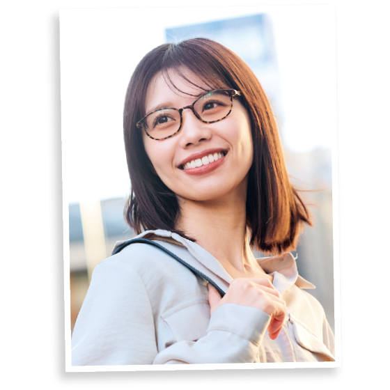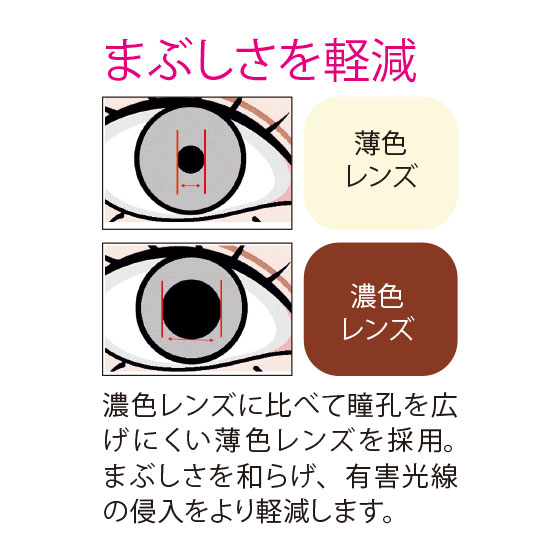 濃色レンズに比べて瞳孔を広げにくい薄色レンズを採用。まぶしさを和らげ、有害光線の侵入をより軽減します。フレームにはしなやかさと軽さを兼ね備えたポリアミド樹脂を採用。弾力性に富んだつるがソフトにフィットして、締めつけ感が少ない軽やかな掛け心地です。