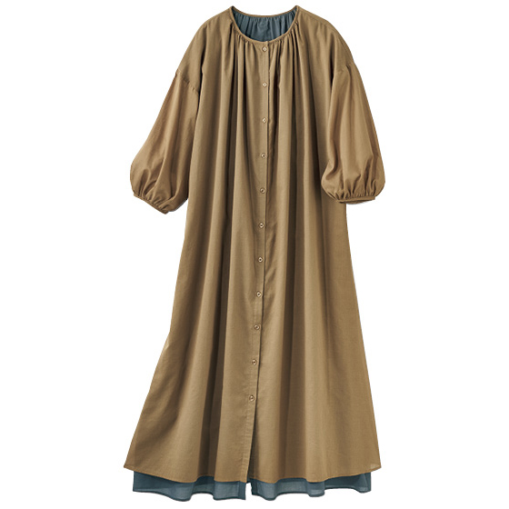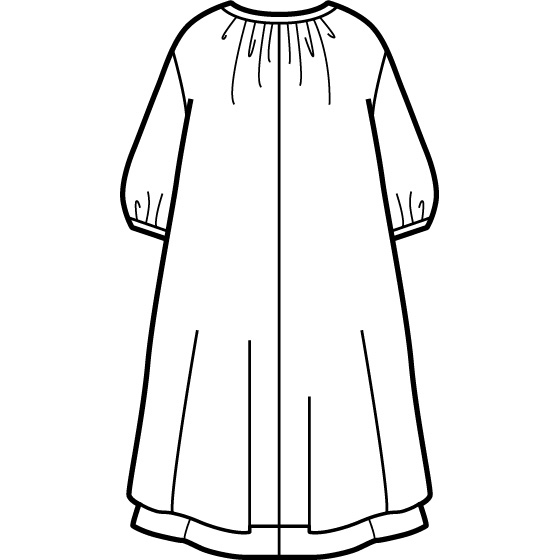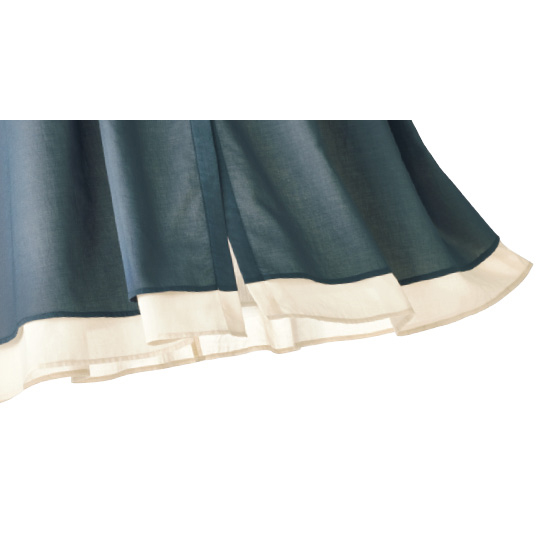 身頃は透け感のある2色のコットンボイル素材を重ねて、裾にバイカラーのアクセント。たっぷりのフレアで風が心地よく通り抜けます。ボリューム袖が腕を華奢見せ。