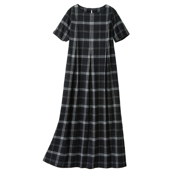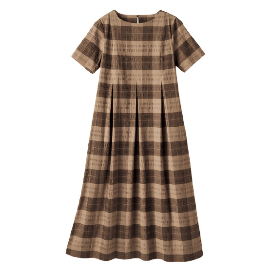 さわやかな着心地でシワが気になりにくいサッカー素材。ウエストタックや二の腕を隠す袖丈で、おとなが着やすい仕様に。