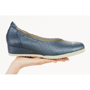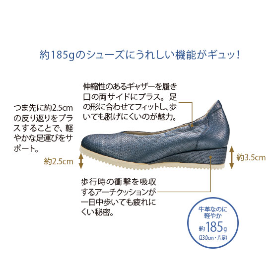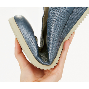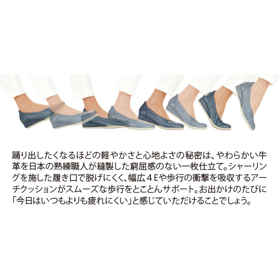 足もとからエレガンスが薫り立つパールネイビーの輝きに、編み込み調の風合いも上品な牛革の高級感…。羽のような軽やかさと吸い付くようなフィット感、そして歩く姿も美しくなるナディーヌ・ビュタンの“軽やかパンプス”。パリの石畳や坂道もらくらく、と評判の機能性が、あなたのお出かけをもっとお洒落に、快適に。一度履けば、いままでの靴には戻れません。