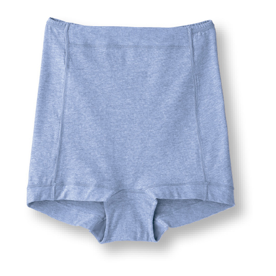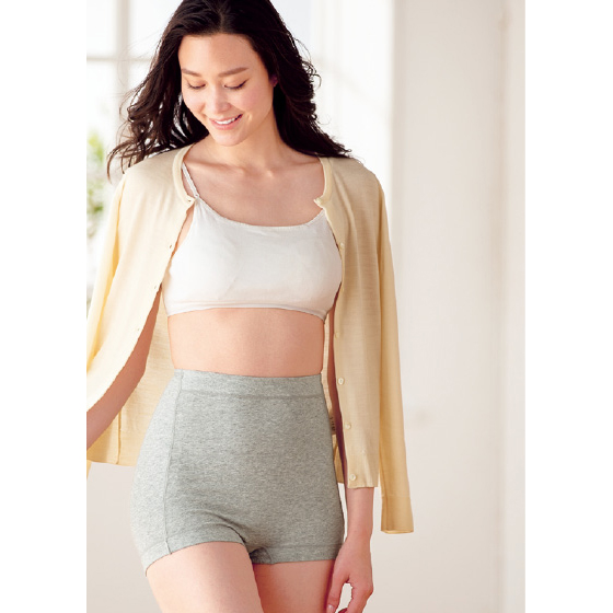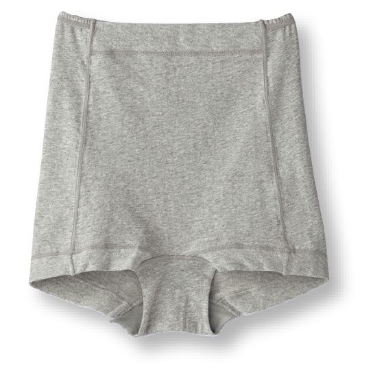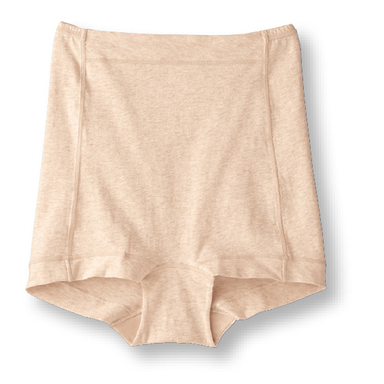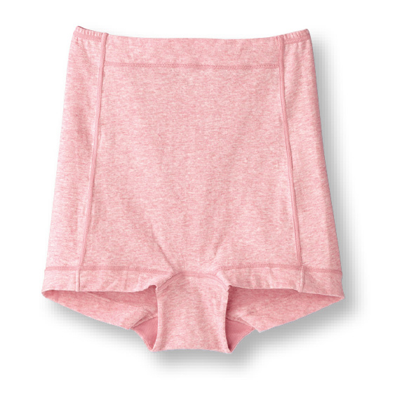 裏側に微起毛をかけ、薄手でも温かみのある肌タッチ。ウエスト前部と脚口は身生地を折り返したラク仕様。●マチ裏は綿100%素材です。