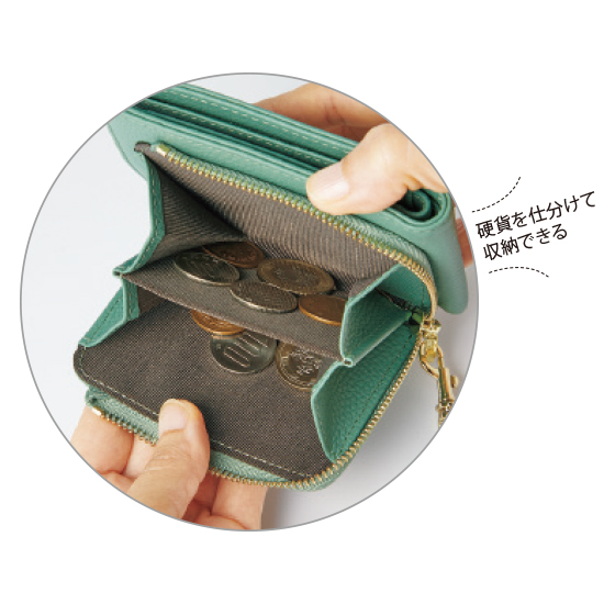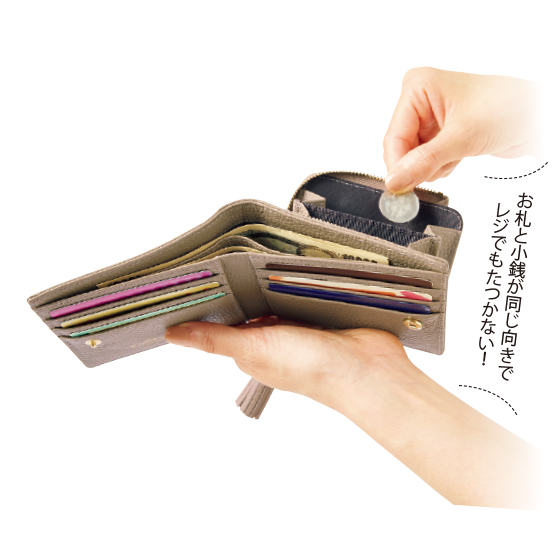 お札と小銭が同じ向きでレジでもたつかない!硬貨を仕分けて収納できる。