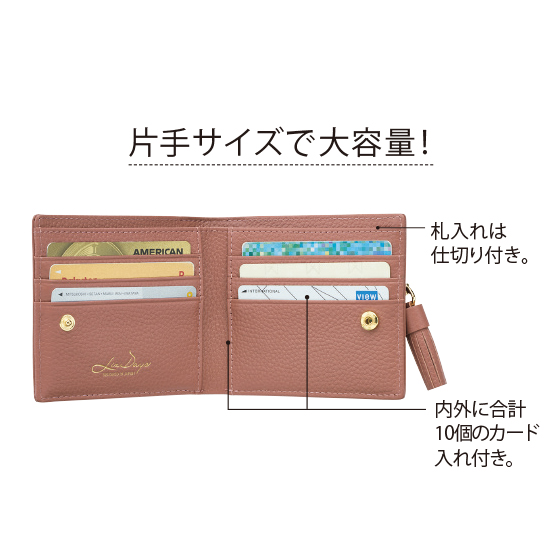 ●仕様:開閉=スナップボタン式、ポケット=外部にファスナー式(小銭入れ)2個・カード入れ2個、内部にカード入れ8個・札入れ2個付き