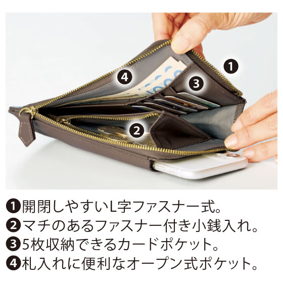 ●仕様:開閉=L字ファスナー式、ポケット=外部にオープン式1個・カードポケット2個・携帯電話入れ1個、内部にオープン式1個・カードポケット5個・ファスナー式小銭入れ1個付き