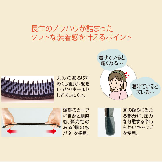 誰もが一度は感じたことのあるカチューシャの締めつけ感を見事に解消!耳の後ろ部分に採用したやわらか触感のキャップと、程よいホールド感を生むオリジナルパーツで快適な装着感を実現しました。老舗カチューシャメーカーが長年のノウハウを結集して開発し、さらに改良を続け辿り着いた逸品です。
