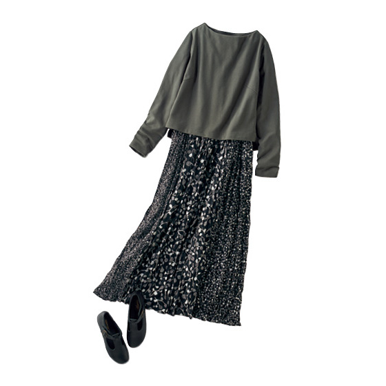 コンパクトなカットソーに、キッピスのヴァアプッカ柄スカートが合体。上下をコーデしたように見えるワンピです。トップスは前後差のある裾で腰回りをカバー。3つのサイズで柄をプリントしたスカートは、細見えする絞りプリーツ。