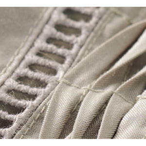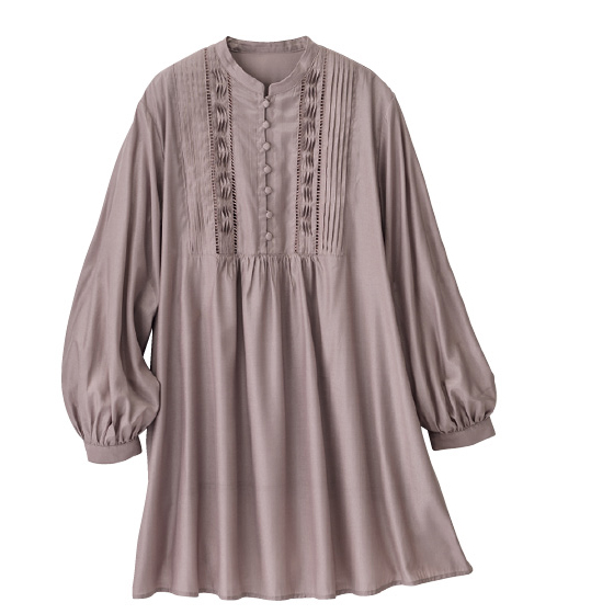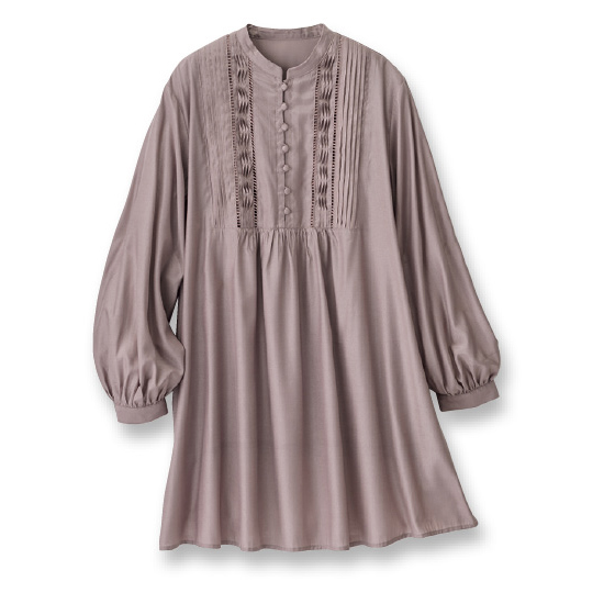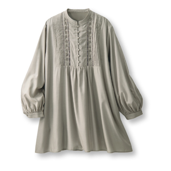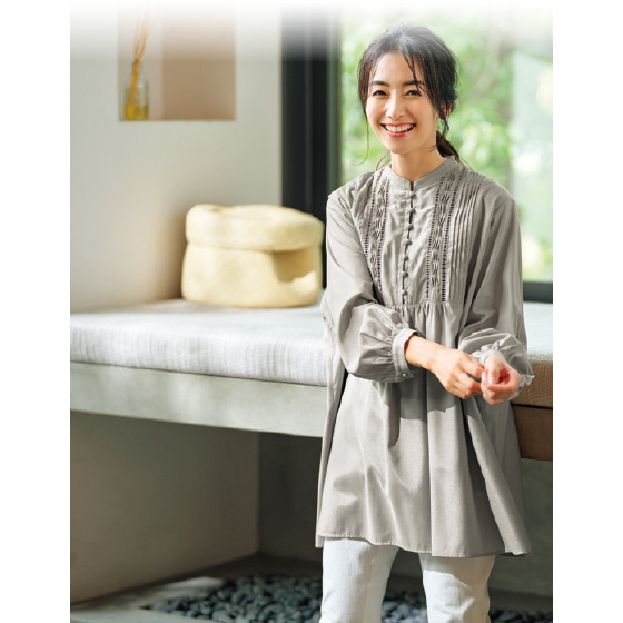 まだ肌寒い時季でも暖かく着られる春らしいブラウスを。そんな思いからつくられたシャツです。上品な光沢の生地を使い、フロントにピンタックやはしごレースなど華やかなディテールをあしらいました。身頃裏には肌当たりよく暖かなカットソー生地を施し、1枚でも主役級の装いに。体のラインを拾いにくいチュニック丈もうれしいポイントです。