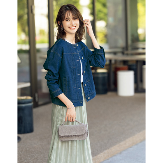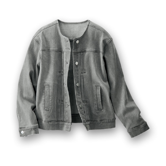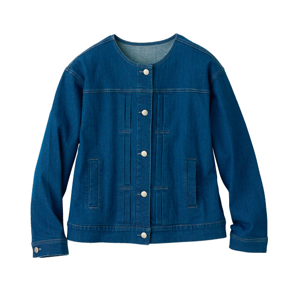 ノーカラーと腰骨丈ですっきり着られる人気Gジャン。前立て横の飾りタックや目立ちすぎない配色ステッチ、肩も少しドロップさせ、やさしい印象で着られます。
