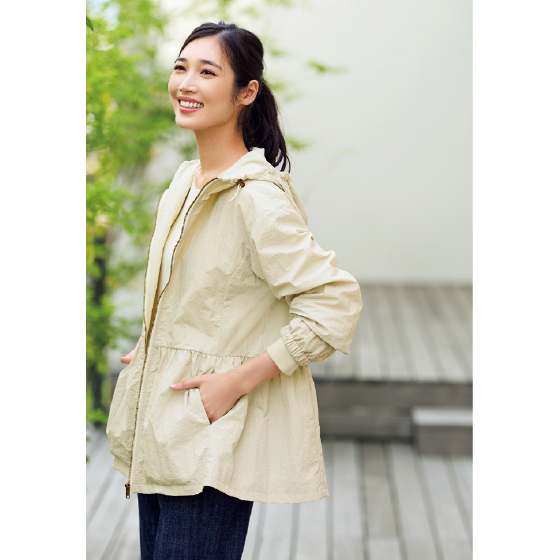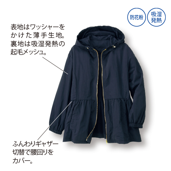 腰切替のペプラムで、ふんわり甘めのシルエット。なのに花粉も雨粒もツルッと落ちて、吸湿発熱の起毛メッシュ裏地でほんのり暖かな実力派です。薄軽のワッシャー生地で、持ち歩きもラク。