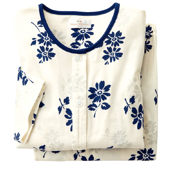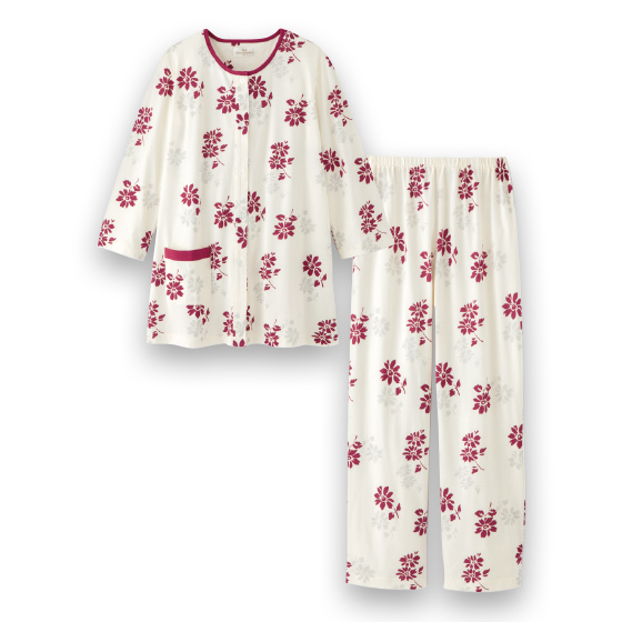 上着は、アームホール、袖口は大きめ。前開きタイプで、脱ぎ着がラクラクです。長く着られる7分袖。右側にポケット付き。パンツはウエスト総ゴム入りです。