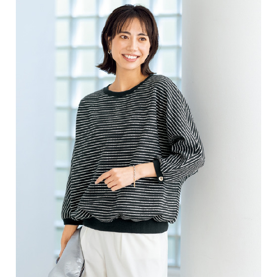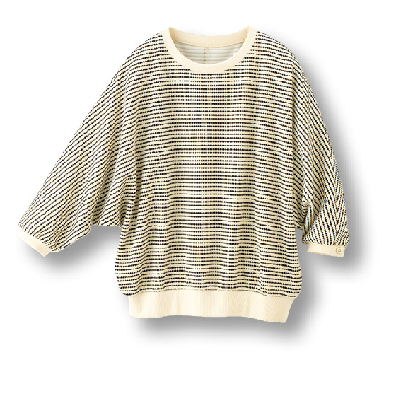立体ボーダーの表情で、コーデのアクセントになるカットソー。ゆるっとリラクシーなシルエットでも、控えめなドルマン袖で上着も着られます。袖口に金色の飾りボタン付き。