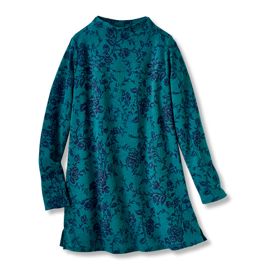 尾州ジャカードのフラワー柄で華やかさを演出。体のラインを拾いにくいほどよいゆとりのAラインシルエットなので、すっきりボトムスと好相性。