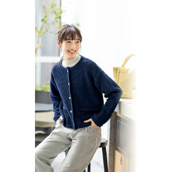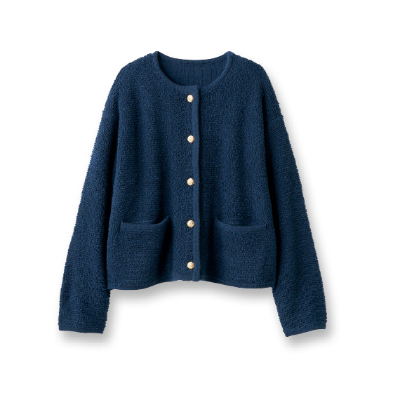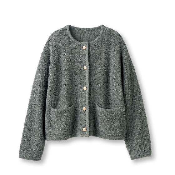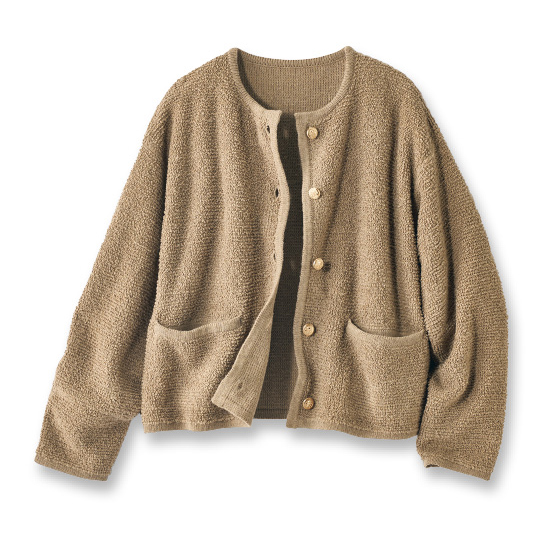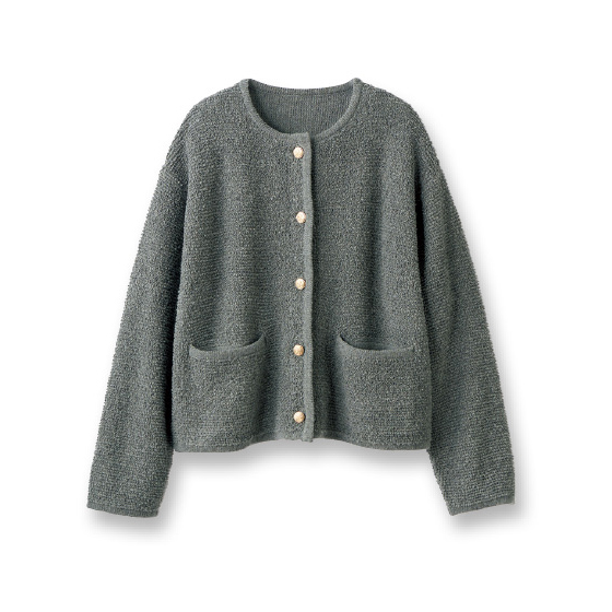 立体感のあるループ編みニットを、トリミングやアンティーク風ボタンで上品な印象に。カーデ感覚でサッとはおれて、タートルネックやシャツなどどんなインナーとも好相性。