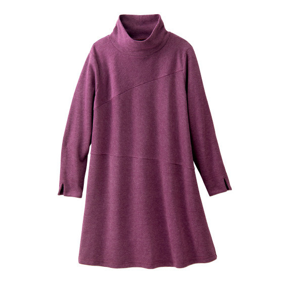 首回りをカバーして、暖かく。裾広がりのチュニック丈で、お腹回りカバー。袖口はおしゃれな折り返しデザイン。