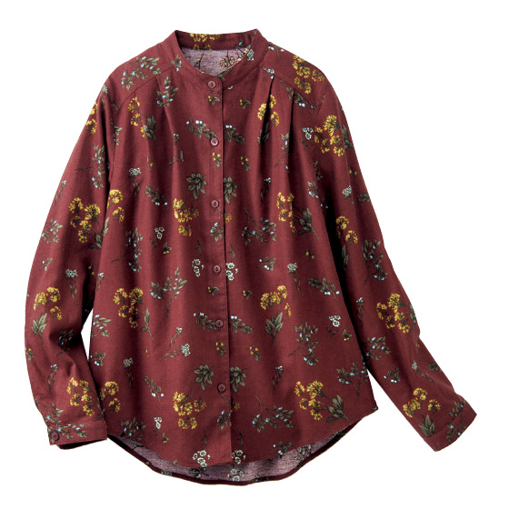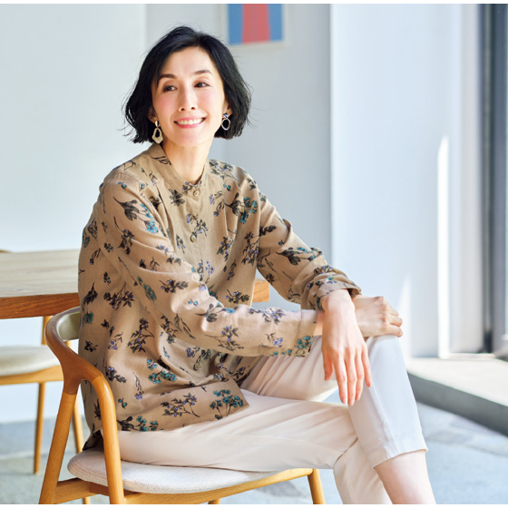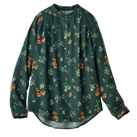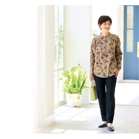 スッキリ品よく見えるスタンドカラー。前面にタックを入れてゆったり感をアップ。後ろ裾は長めでヒップをカバー。